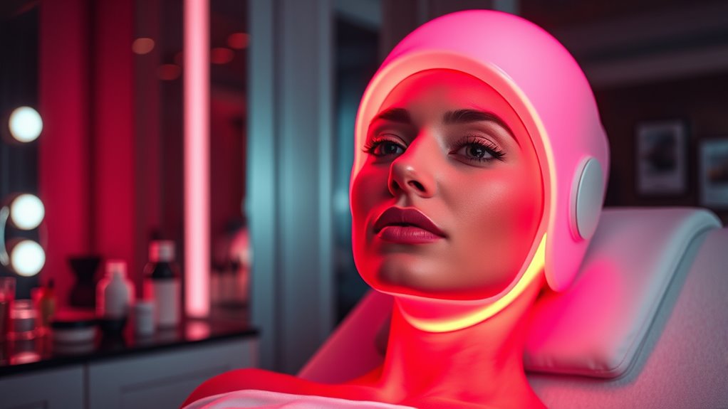 When it comes to skincare benefits, red-light therapy is a game-changer. It stimulates collagen production, which firms and smooths your skin, reducing fine lines and giving you a radiant glow. If you’re worried about puffiness or dullness, this treatment can help brighten your complexion, making you look more awake and refreshed. It’s a quick, non-invasive way to combat tired skin and guarantee you put your best face forward. Many professionals incorporate it into their beauty routines because it enhances skin health without the use of harsh chemicals or invasive procedures.
