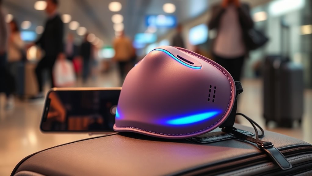 Yes, there are safety concerns when using LED masks on the go. You should avoid excessive UV exposure and guarantee the device doesn’t overheat, which could cause burns or damage. Always follow the manufacturer’s instructions, keep the device at recommended intervals, and avoid prolonged use. Be mindful of your skin’s reaction, and if you notice discomfort or overheating, stop use immediately to protect your skin and safety.