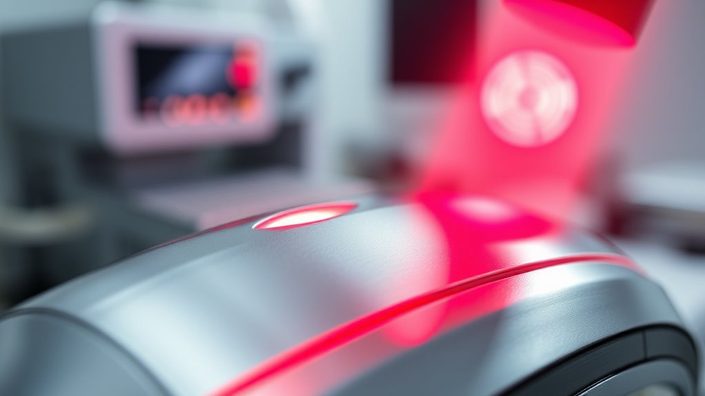 Think of laser therapy as a double-edged sword—you get targeted results, but potential side effects exist. With 633 nm red light, you might experience mild skin sensitivity, redness, or swelling, especially if you have sensitive skin. Laser safety is essential; always follow your dermatologist’s advice. Rarely, more serious issues like burns or pigmentation changes can occur, but these are minimized with proper settings and precautions.