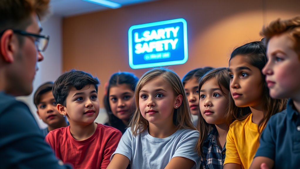 When using LED lights, always buy from trusted brands with safety certifications like UL or ETL to prevent fire hazards. Follow the installation instructions carefully and avoid modifying the lights or wiring. Use the correct power sources, keep cords away from flammable materials, and turn off lights when not in use. Regularly check for damage to guarantee safety and prevent accidents. Keep exploring to discover more tips on keeping your space both fun and safe.