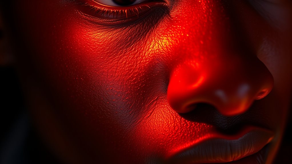 When using LED therapy on darker skin tones, you should focus on wavelengths like red and near-infrared, which penetrate deeper and reduce the risk of pigmentation issues. It’s important to work with trained professionals who can customize treatment settings to your skin type, protect your skin from sun exposure, and follow proper aftercare. This helps guarantee safe, effective results while minimizing risks. To learn more about making LED therapy work best for your skin, keep exploring the details.
