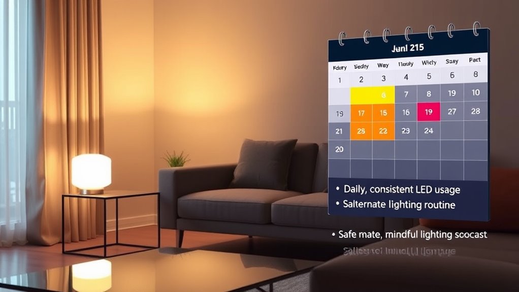 Scheduling your LED use wisely can extend its lifespan. When you limit usage to alternate days, you reduce wear and tear, preventing overheating and electrical stress. This careful approach decreases the chances of component failure, helping your device last longer. Conversely, daily use might accelerate aging. By managing your schedule, you optimize longevity, ensuring your LED remains efficient and reliable over time.