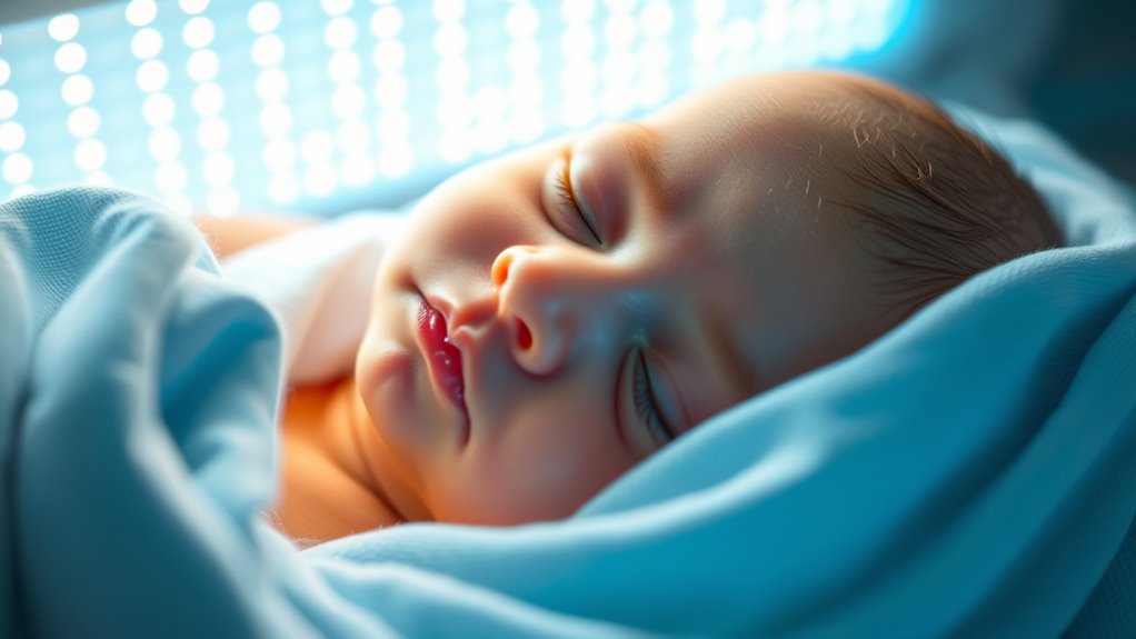 LED therapy treats newborn jaundice by using specific blue-green light wavelengths, usually around 460-490 nm. When you place your baby under this light, it helps break down excess bilirubin in the skin into forms that your body can easily eliminate through urine and stool. The targeted light works efficiently and safely, minimizing side effects. If you want to understand how selecting the right wavelength makes this treatment more effective, keep exploring.