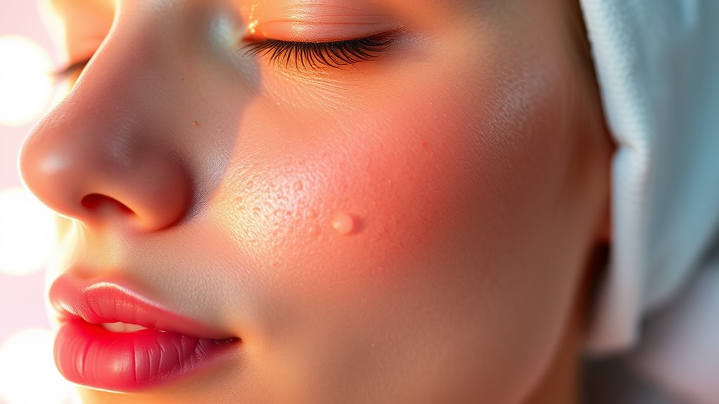 Light therapy doesn’t directly improve hydration levels in your skin, but it can enhance blood circulation and stimulate cellular activity. This boost helps your skin better absorb moisturizers and humectants, which do improve hydration. To maximize benefits, combine light therapy with hydrating products. You’ll notice a more plump, glowing complexion as your skin becomes more receptive to moisture, making your overall skincare routine more effective.