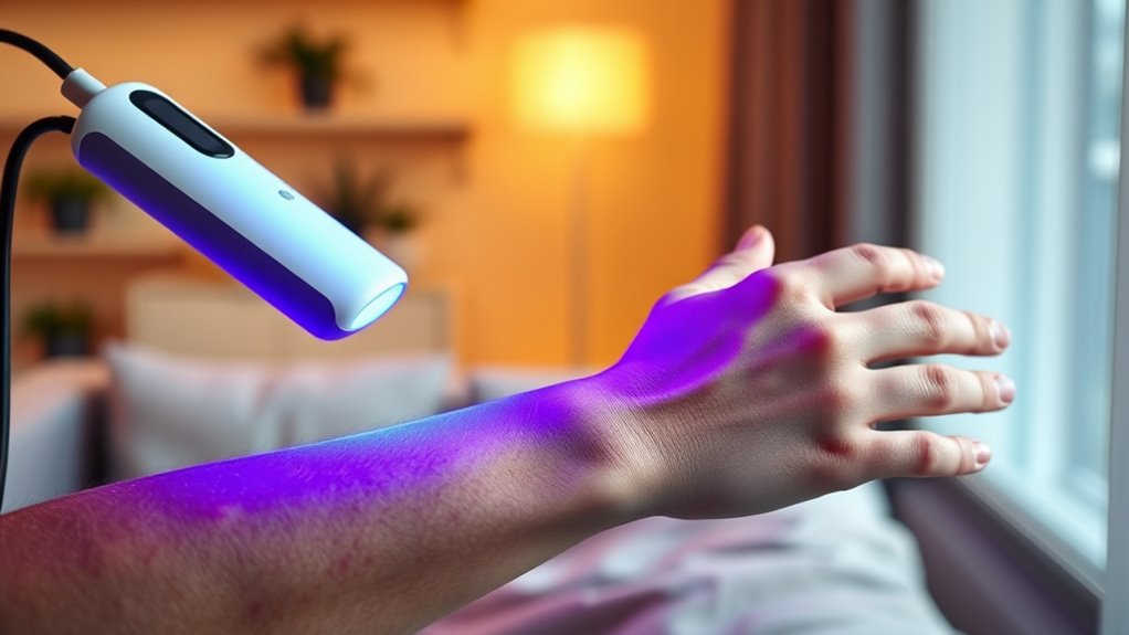 Light therapy for psoriasis uses controlled UV light to reduce inflammation, slow skin cell growth, and improve symptoms. It can lead to clearer skin and lessen plaques and scaling when done regularly under professional supervision. However, it’s important to manage side effects like skin burns and premature aging by following safety precautions. With proper guidance and monitoring, this non-invasive treatment offers promising results—learn more about how you can safely benefit from it.