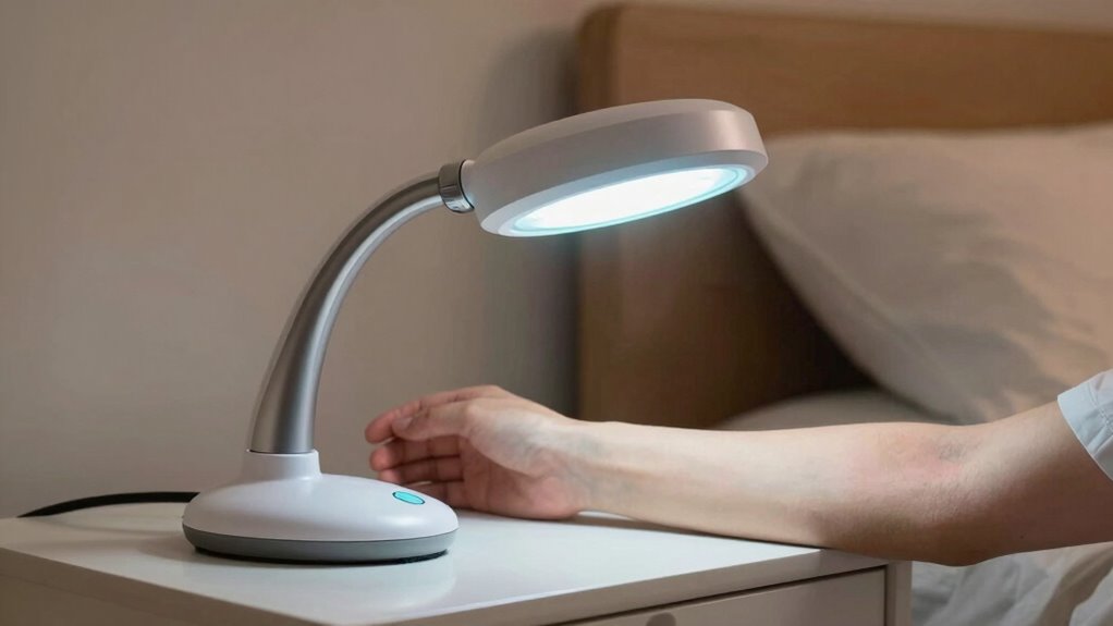 To get the best results, you need to set up your phototherapy lamp at the right height and position your body correctly. Make sure the lamp is neither too close nor too far away, and maintain consistent session times. Proper setup guarantees safe, effective treatment with minimal side effects. Additionally, understanding lighting safety guidelines can help prevent accidental overexposure and ensure optimal therapy outcomes. Being aware of work-life balance principles can also reduce stress associated with treatment routines and improve overall well-being. Ensuring your environment has proper ambient lighting conditions can further enhance the safety and effectiveness of your therapy sessions. Paying attention to device maintenance can also prolong the lifespan of your lamp and maintain consistent performance.