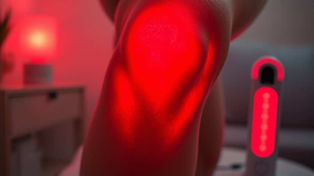 Red-light therapy provides a safe, non-invasive way to reduce pain and speed up joint recovery. It works by using specific red and near-infrared wavelengths to penetrate deep into tissues, stimulating cellular activity and promoting healing. This process helps reduce inflammation, swelling, and soreness, leading to improved mobility and tissue repair. When used consistently over time, red-light therapy can enhance your recovery efforts. Keep exploring to discover how to get the best results for your needs.