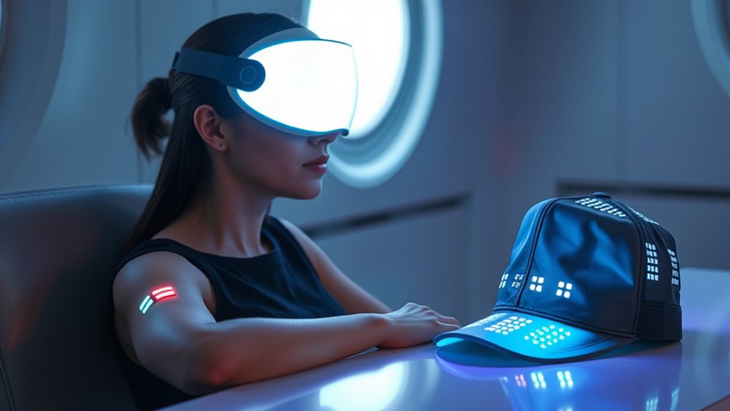 Wearable light therapy devices like masks, patches, and hats use specific wavelengths to penetrate your skin and target underlying tissues. Red and near-infrared lights reach deeper layers, promoting cellular activity that can boost your mood and energy. The devices include safety features such as adjustable brightness and timers to prevent overexposure. By understanding how these tools work and their safety measures, you’ll see how they could benefit you—more details await if you continue exploring.