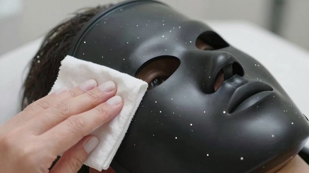 To effectively clean your LED mask, start by unplugging it and removing any detachable parts, such as straps or filters. This guarantees proper LED hygiene and prevents damage during cleaning. Next, prepare a soft cloth with a gentle cleaning solution or alcohol wipe. Use the cloth to wipe down the mask’s surface carefully, avoiding direct contact with the LEDs. Focus on areas prone to sweat and dirt buildup. For equipment sterilization, regularly disinfect detachable parts separately. Follow this table to guide your cleaning process: