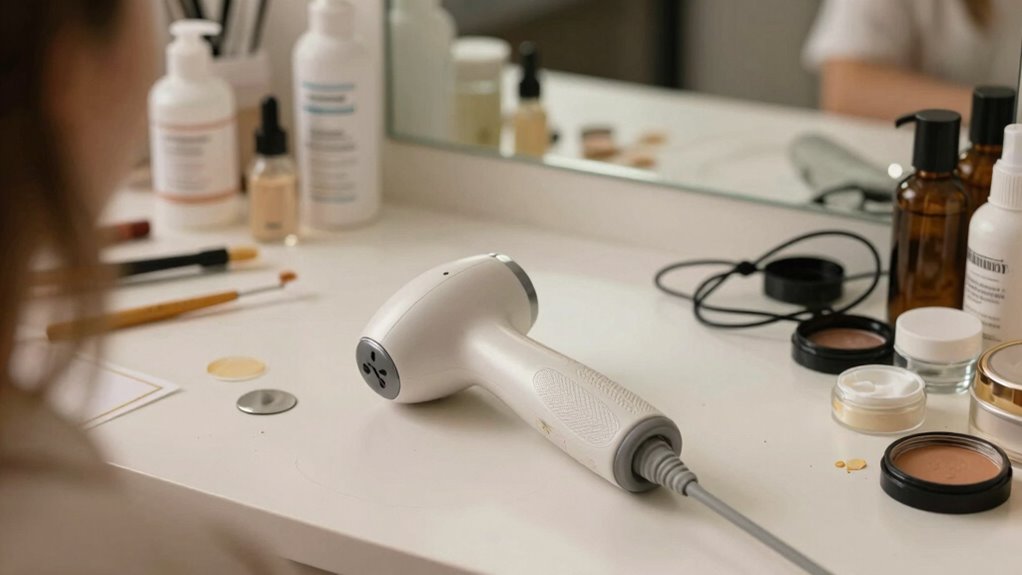 You don’t need skincare products for microcurrent treatments, but using compatible ones can enhance results. Skincare compatibility is key, so choose products formulated for microcurrent use to avoid interference. While some users see benefits without additional products, incorporating serums or gels can improve conductivity and skin hydration. Product necessity depends on your skin type and goals, but always verify compatibility to prevent adverse reactions and maximize the treatment’s effectiveness.