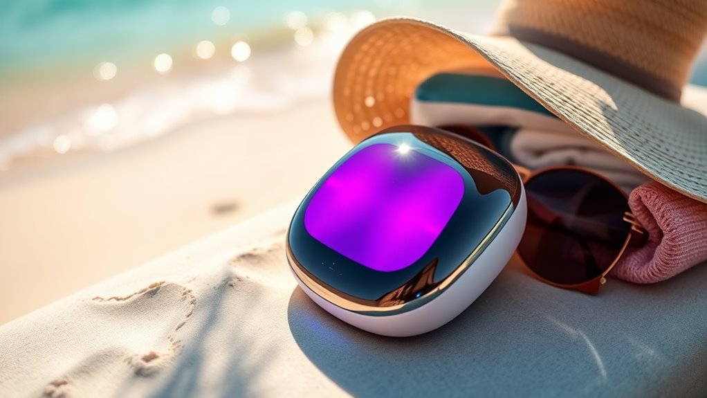 When traveling, using portable LED devices helps you maintain your skincare routine and protect your skin from environmental stressors like dry cabin air and changing climates. These compact tools boost circulation, reduce puffiness, and improve skin tone, all while enhancing the absorption of your favorite products. Incorporating LED therapy into your routine is quick and versatile, ensuring your skin stays radiant on the go. Keep exploring to discover how these devices can become your skincare secret.