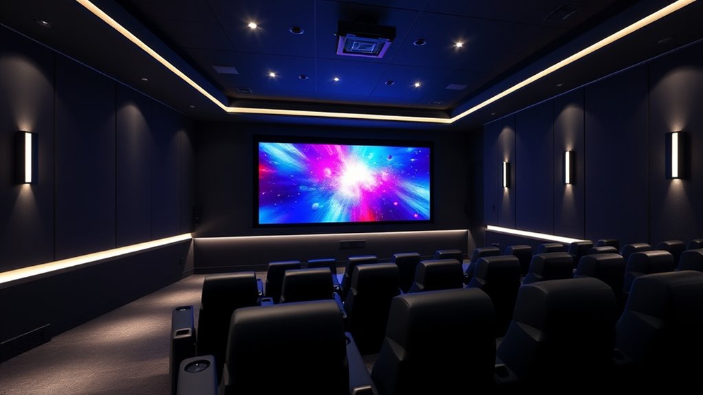 Brightness plays a crucial role in how well your home theater projector performs, especially in varied lighting conditions. Measured in lumens, higher ratings mean better visibility in bright rooms. For home theaters, I recommend a projector with at least 1500 to 3000 ANSI lumens to guarantee clear images even with ambient light present. Increased brightness lets you use larger screens without losing image quality or detail. However, it’s essential to balance brightness with contrast ratio to achieve vibrant colors and deep blacks. External lighting, like daylight or room illumination, greatly affects how vivid your projection appears. If your room isn’t fully dark, choosing a projector with higher lumens helps maintain visibility without sacrificing image quality. Brightness truly makes or breaks your viewing experience in real-world conditions.