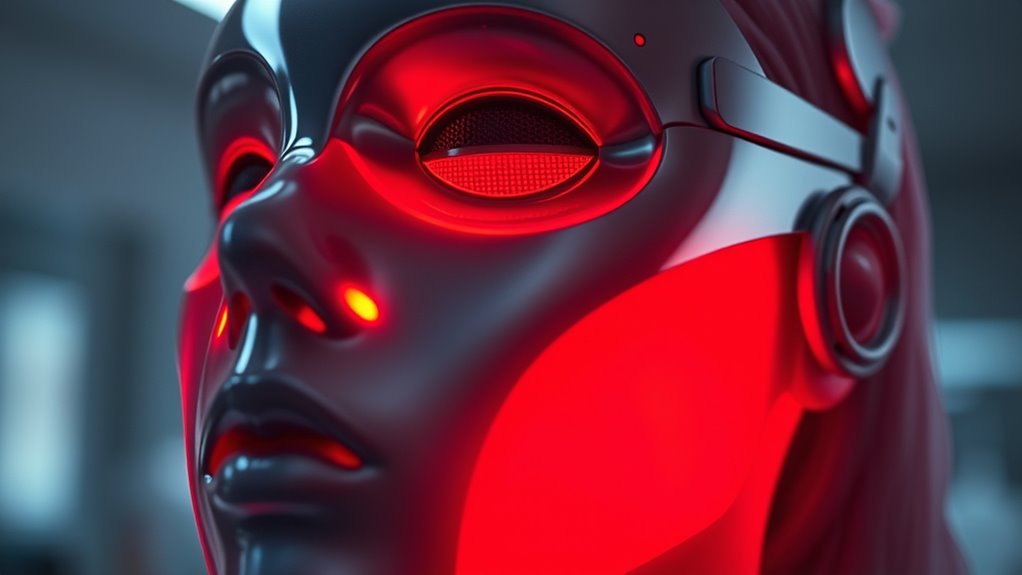 Choosing an 830 nm near-infrared mask hinges on selecting the right wavelength and power level to maximize treatment results. Precise wavelength selection at 830 nm guarantees deep tissue penetration, which is vital for collagen regeneration and skin rejuvenation. Higher irradiance levels, measured in mW/cm², improve effectiveness by delivering enough energy to target tissues efficiently. Consistent wavelength output across LEDs guarantees uniform treatment, avoiding hotspots or uneven exposure. Wavelength purity and a narrow spectral bandwidth enhance therapy specificity, reducing the risk of unintended light absorption. When both power and wavelength accuracy are optimized, you get maximum clinical benefits while maintaining safety, especially important for at-home use. Ultimately, these factors ensure you’re getting a safe, effective, and reliable near-infrared treatment.