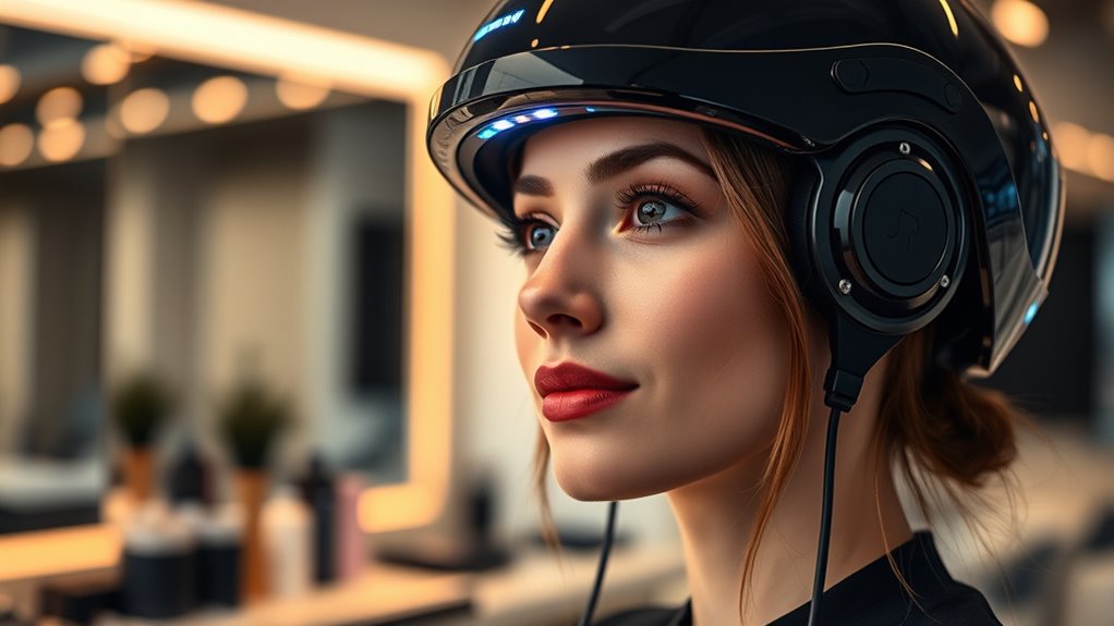 To guarantee a smooth and effective experience with a cordless hair laser helmet, it’s important to focus on its ease of use design. Look for models with intuitive controls and simple operation, so you can easily incorporate treatments into your daily routine. An adjustable fit and cushioning are key for comfort, ensuring the helmet stays secure without causing discomfort. A lightweight, ergonomic design helps prevent fatigue, allowing for longer wear sessions. User-friendly features like minimal buttons or clear digital displays make operation straightforward. Additionally, rechargeable batteries and easy charging options provide convenience, so you can keep the device ready for use without hassle. Prioritizing these design elements makes hair regeneration treatments more accessible and enjoyable at home.