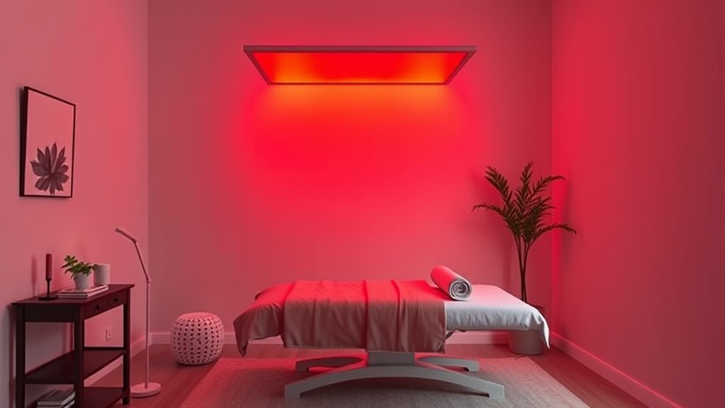 Selecting an EMF-shielded red light panel isn’t just about safety features; the wavelengths it offers considerably influence how effectively it targets specific tissues. Typically, red light around 630-660nm benefits skin health and collagen production, making it ideal for surface treatments. Near-infrared light, between 810-940nm, penetrates deeper, reaching muscles and joints to promote pain relief and recovery. Some panels feature multiple wavelengths, such as 630nm, 660nm, 850nm, and 940nm, providing versatile options for both superficial and deep tissue therapy. The choice of wavelength determines penetration depth and treatment focus. Dual- or multi-wavelength panels allow customization, letting you tailor sessions for skin rejuvenation, inflammation reduction, or muscle healing. This variety enhances the panel’s adaptability to your specific health goals.