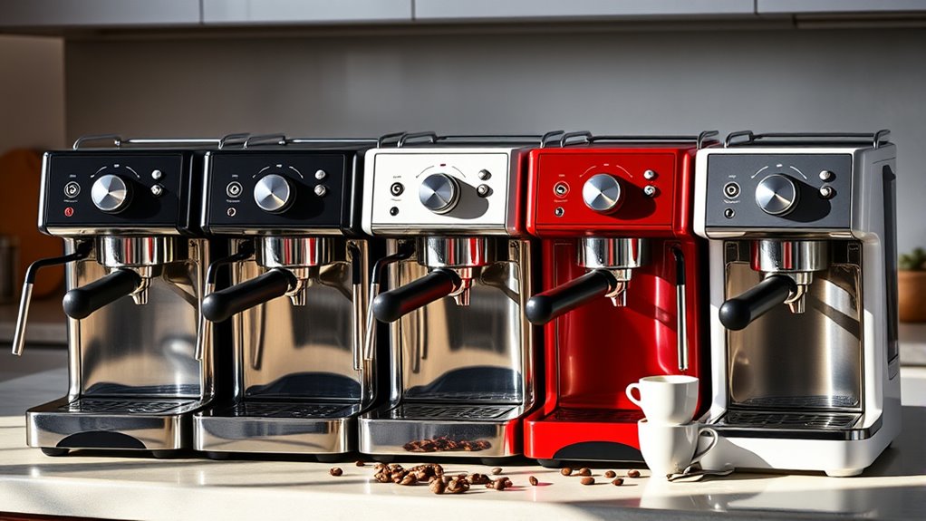 Looking to make cafe-quality espresso at home? I recommend starting with machines that have high-pressure pumps (15-20 bars), quick heat-up times, and user-friendly features like adjustable steam wands and intuitive controls. Compact designs that fit small spaces and easy-to-clean components make the whole process simpler. If you want to know which models are the best for beginners in 2025 and what makes them stand out, keep exploring further.