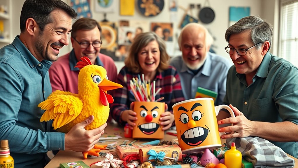 Think of funny, budget-friendly gifts as treasure chests filled with laughter without emptying your wallet. I love gifting silly mugs with witty sayings, quirky socks with bold patterns, or hilarious fake prizes like rubber chickens. These gifts are easy to find online or at dollar stores. They spark joy and giggles, proving that humor doesn’t have to come with a hefty price tag. Plus, everyone loves a good laugh on a budget!