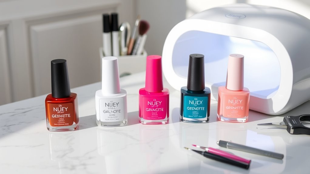 Choosing a gel nail kit that’s easy to use can make a big difference in your nail journey. Look for a kit with a user-friendly UV or LED lamp that has automatic sensor control—this simplifies curing and reduces mistakes. Clear, step-by-step instructions and tutorials are essential for beginners, helping you understand each step of the process. A set with beginner-friendly gels, including base and top coats, ensures easy application and good adhesion. Tools like nail files, buffers, and cuticle pushers are also important for proper nail prep. Additionally, quick-drying formulas with curing times around 30-60 seconds save time and make the whole process smoother. Prioritizing ease of application helps you achieve salon-quality nails with less frustration.