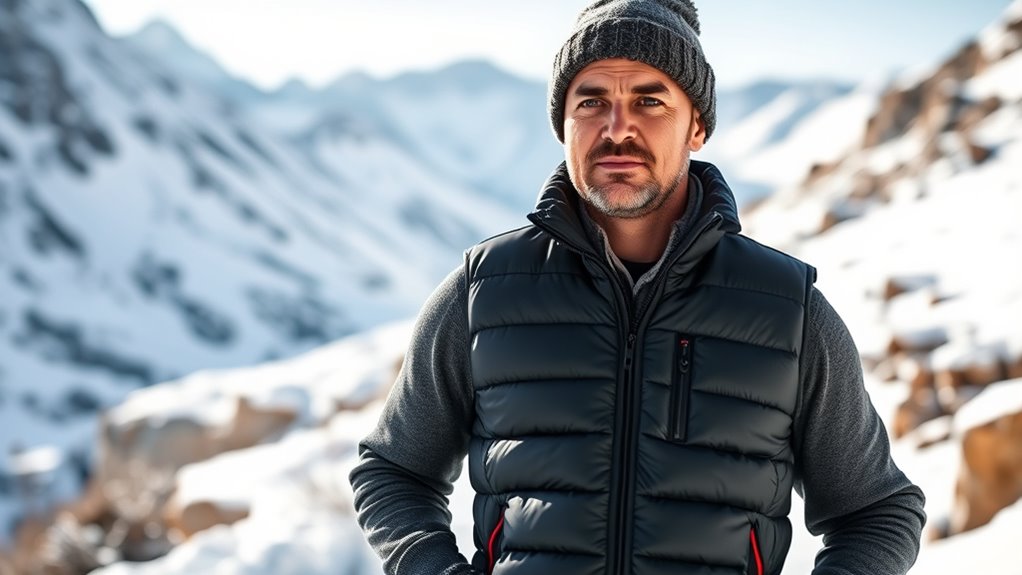 When choosing a heated vest for men, ease of operation is a top priority to guarantee you can quickly and comfortably adjust the warmth when needed. Look for vests with intuitive control buttons or touch interfaces that make changing settings straightforward. Clearly labeled heating zones and simple zone controls allow you to customize warmth without hassle. Opt for garments with one-touch operation or pre-set modes for quick adjustments, especially when you’re outdoors and in a rush. Make sure the control panel or switches are designed to be operated with gloves on, so cold fingers don’t slow you down. Finally, user-friendly indicator lights or displays that show the current temperature or heating status help you stay aware of your vest’s performance at a glance.