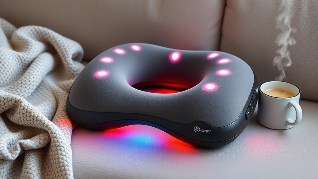 An ergonomic design fit is essential for maximizing comfort and support in an LED neck pillow massager. It ensures the pillow conforms to the natural curves of your neck and shoulders, providing ideal support and reducing strain. A well-designed pillow evenly distributes pressure, preventing discomfort during long sessions. Look for adjustable straps or customizable contours to accommodate different neck sizes and shapes, ensuring a personalized fit. This not only enhances comfort but also helps maintain proper spinal alignment, which can alleviate neck pain and improve posture over time. Additionally, lightweight and contoured designs boost stability, so the pillow stays securely in place whether you’re sitting or lying down. Prioritizing ergonomic fit means you’ll enjoy more effective relief and a more comfortable experience overall.