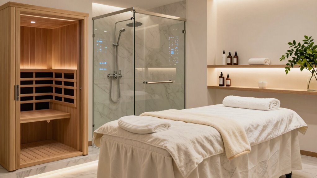 Choosing the right luxury home spa equipment requires careful consideration of your space and storage options. I always start by measuring my available area to guarantee the equipment fits comfortably without overcrowding. Multi-functional or collapsible designs are game changers—they save space and can be tucked away easily when not in use. I also look for built-in storage solutions like cabinets, shelves, or drawers to keep accessories organized and within reach. It’s essential to leave enough clearance around the equipment for safe operation and easy movement. If space is limited, I opt for compact or portable models that can be stored away conveniently. Prioritizing thoughtful space planning ensures my spa remains functional, inviting, and clutter-free.