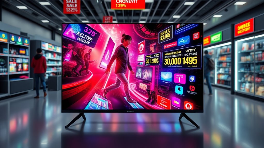 During Cyber Monday, warranty and return policies are usually similar to regular times, but some stores might offer extended returns or special warranties to attract buyers. I recommend checking each retailer’s policy before purchasing, especially for big-ticket items like OLED TVs. Sometimes, you can find extra protections or better return windows, so don’t forget to review those details to guarantee you’re covered if anything goes wrong.