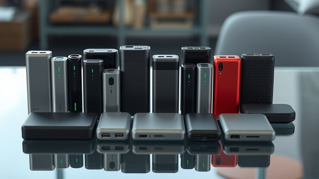 Having multiple charging options and ports is essential for guaranteeing your RLT device and other gadgets stay powered up when you need them most. Look for a power bank that offers various ports like USB-A, USB-C, or even wireless charging to handle multiple devices at once. Fast charging support, such as Power Delivery (PD) or Quick Charge (QC), can considerably cut down charging times for compatible devices. It’s also important to check the input and output wattage—ideally 18W or higher—to enable quick recharging of the power bank itself and efficient device charging. Consider the number and type of ports to guarantee versatility, whether you’re charging smartphones, tablets, or laptops. Compatibility with your device’s connectors and standards guarantees safe, effective power transfer.
