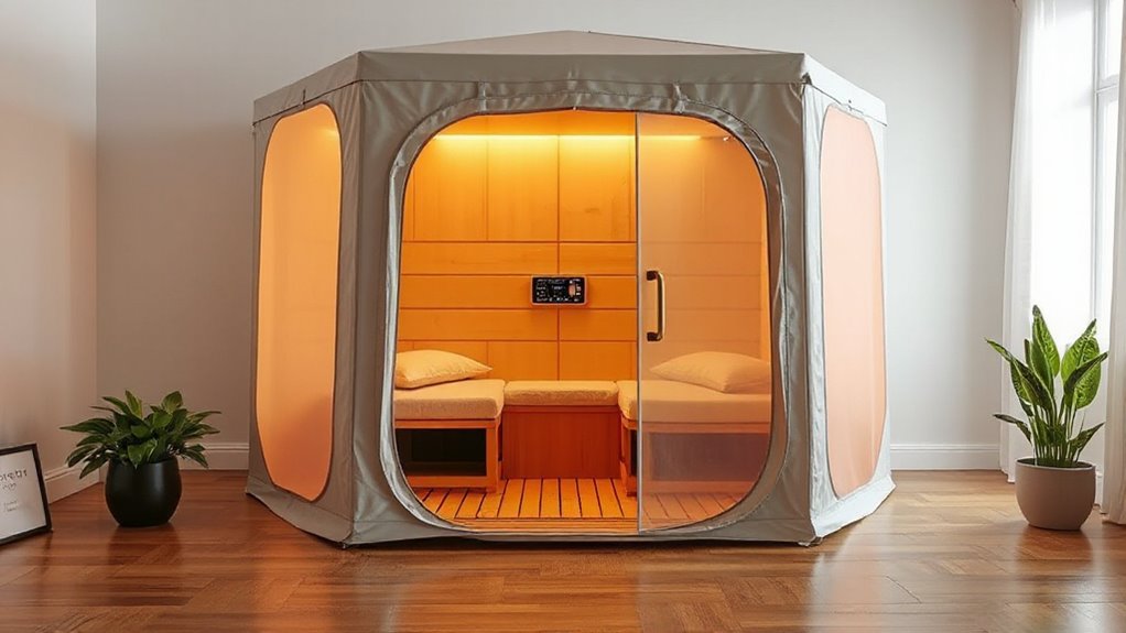 Incorporating additional therapy options like red light therapy or steam therapy can considerably boost the benefits of your portable infrared sauna by targeting specific health concerns such as skin rejuvenation, pain relief, and detoxification. Red or near-infrared light therapy penetrates deeper into cells, promoting faster recovery and enhanced circulation. When combined with infrared heat, it amplifies healing effects. Some saunas include steam therapy, creating a humid environment that opens pores, moisturizes skin, and supports respiratory health. Multiple therapy modalities in one unit allow you to address a broader range of issues, from muscle soreness to inflammation and skin aging. Adjustable settings for heat and light give you the flexibility to customize routines, ensuring a personalized wellness experience tailored to your needs.