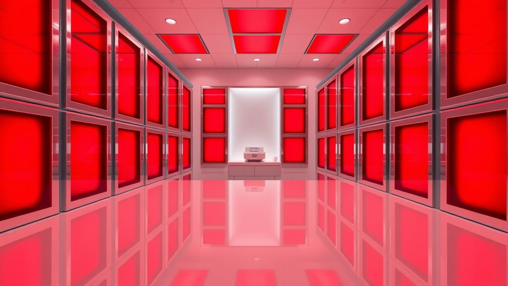 During red light therapy sessions, I always wear protective eye gear to shield my eyes from the light. I follow the clinic’s instructions carefully, avoiding overexposure and keeping sessions within recommended time limits. I also guarantee the equipment is properly maintained and sanitized to prevent any risks. If I notice any discomfort or skin reactions, I stop immediately and consult with a professional.