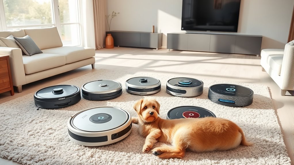 If you want to keep pet hair under control, I recommend these top-rated robot vacuums: the iRobot Roomba Plus with its auto-empty dock, the eufy 11S MAX for powerful suction, the Eufy C10 with smart mapping and self-emptying, the Tikom G8000 Max combo for vacuuming and mopping, and the Roborock Q10 S5+ with advanced navigation and pet hair handling. These models combine strong suction, smart features, and convenience to make pet hair cleanup effortless. Keep going to discover which one suits your home best.