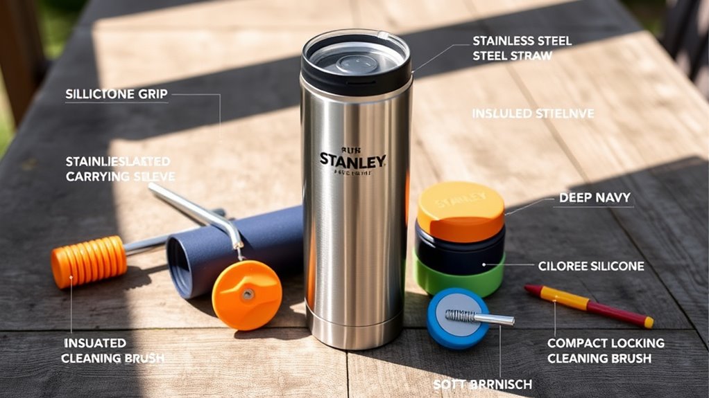 If you want to upgrade your Stanley tumbler, I recommend checking out accessories like insulated carriers with phone pockets for added protection and convenience, silicone bumpers that shield the bottom from dents, impact-absorbing silicone sets with dust covers, and stylish insulation options for better temperature retention. These upgrades not only protect your tumbler but also make hydration easier and more stylish. Stay tuned to discover more about these top accessories and which ones might be right for you.