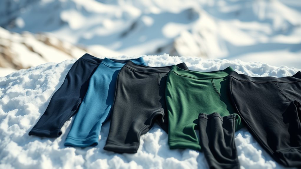 Choosing the right thermal underwear for skiing hinges on selecting materials that balance moisture management, warmth, and flexibility. I look for fabrics with high polyester content, around 90-95%, because they wick moisture effectively and dry quickly—crucial for staying comfortable on the slopes. A fleece lining or plush interior adds insulation, trapping heat and keeping me warm in cold conditions. Four-way stretch fabrics are a must, providing the flexibility needed for dynamic movements without restriction. Breathable materials prevent overheating and moisture buildup, maintaining comfort during intense activity. Additionally, seamless or flatlock stitching reduces chafing and irritation, which is essential for all-day wear. Overall, material performance directly impacts comfort and functionality, making it a key factor when choosing thermal underwear for skiing.