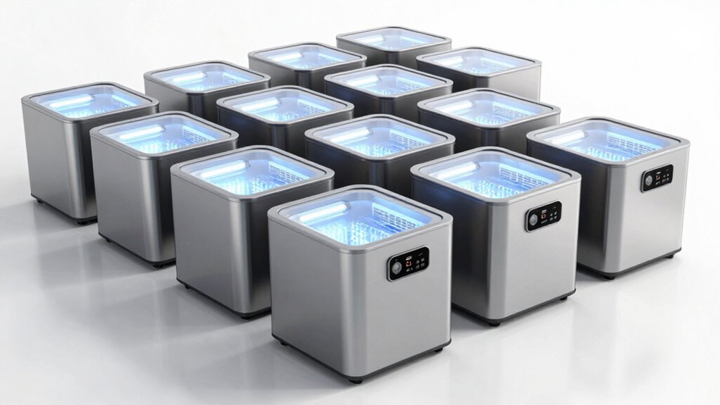 If you’re looking for the 14 best large UV sanitizing boxes for 2026, I’ve found a range that includes models with spacious capacities, advanced UVC and ozone technologies, and safety features like automatic shut-off and child locks. These options are perfect for disinfecting household items, tools, and personal belongings quickly and effectively. Keep exploring, and you’ll discover more details about these top choices to find the perfect fit for your needs.